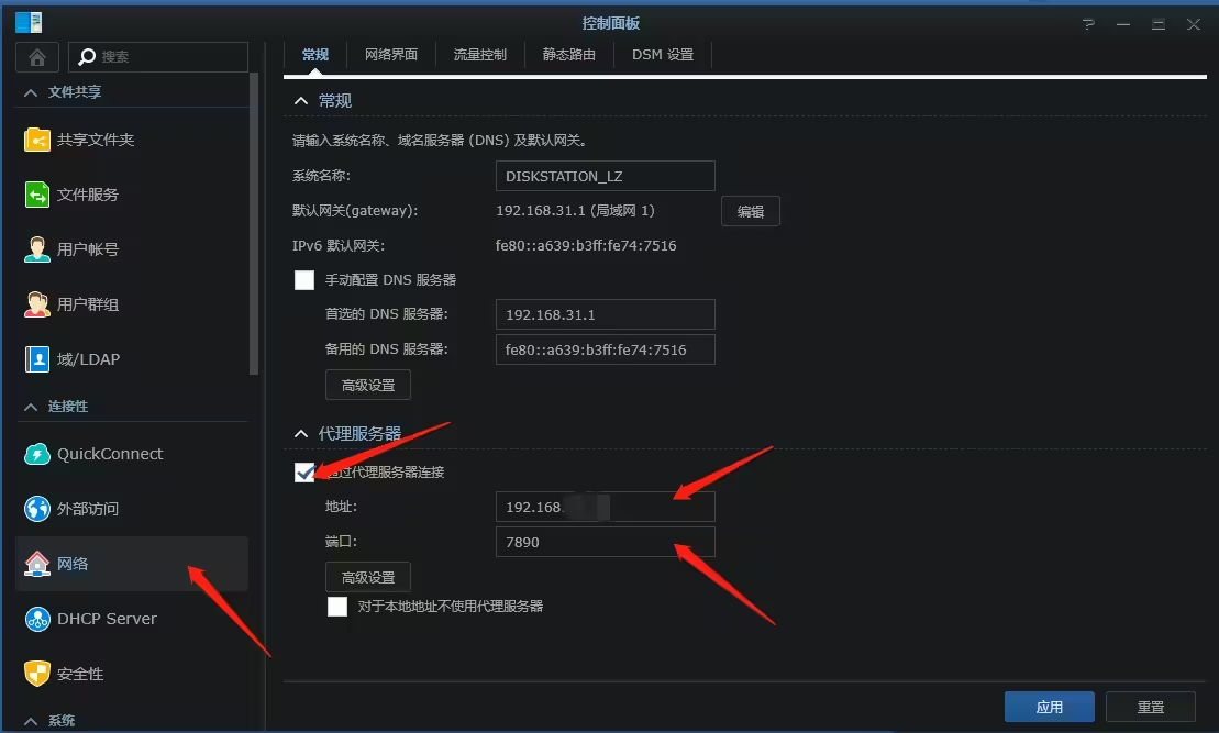 3.群晖端设置代理。勾选通过代理服务器连接,地址填写自己电脑的局域网ip,端口填写clash默认端口7890,点击应用。