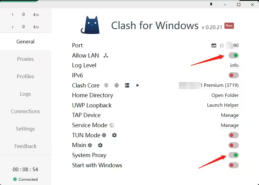 开启Clash的Allow LAN 和System Proxy。