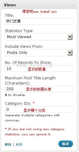 Most Viewed Template:侧边栏 Widget 显示浏览量最多的文章(亦称“最受欢迎文章”)列表时的显示格式。可用%VIEW_COUNT%、 %POST_TITLE%、%POST_EXCERPT%、%POST_CONTENT%、%POST_URL%对其进行参数设置