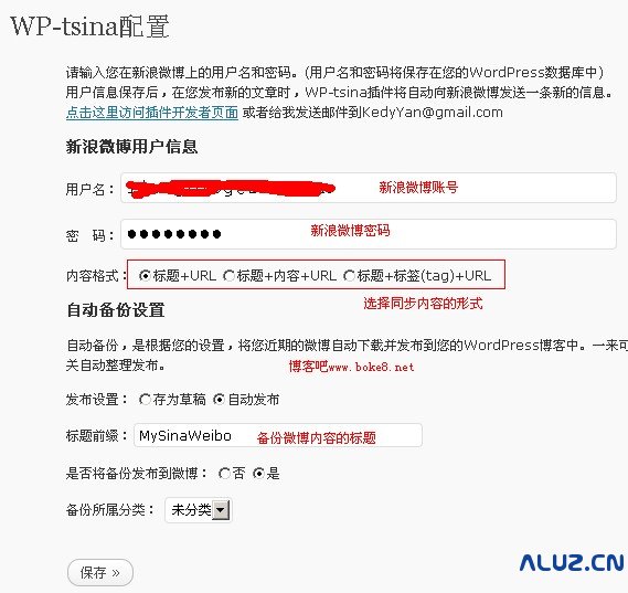 这里需要说明的是备份,发布设置选择存为草稿,从微博备份到WordPress博客的内容将会以草稿的形式存在文章列表中,自动发布则以文章的形式发布;标题前缀可以自由修改;是否将备份发布到微博,选择是的话,则备份成功后,在新浪微博中会发布一条备份文章的URL地址。